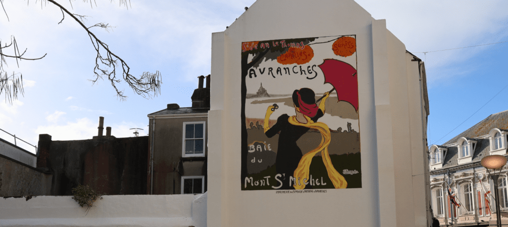 The mural is entitled ‘Avranches – Baie du Mont St Michel’ and depicts the view over the bay of Mont St Michel. ‘Saint-Jean-de-Tomas’, ‘Carolles’, and ‘Genêts’ listed at the top of the image are all small towns in Avranches.